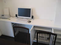 ダイニングのコーナーに、パソコンデスクを製作しました。パソコン本体とプリンターは、収納したまま使えるアイデア収納です。 壁面コンセントの位置に考慮して設計しました。 食器棚もオーダーで製作いただきました。